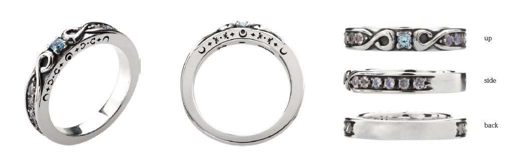 戒指兩側的寶石是藍色月光石,象徵月亮的光輝。