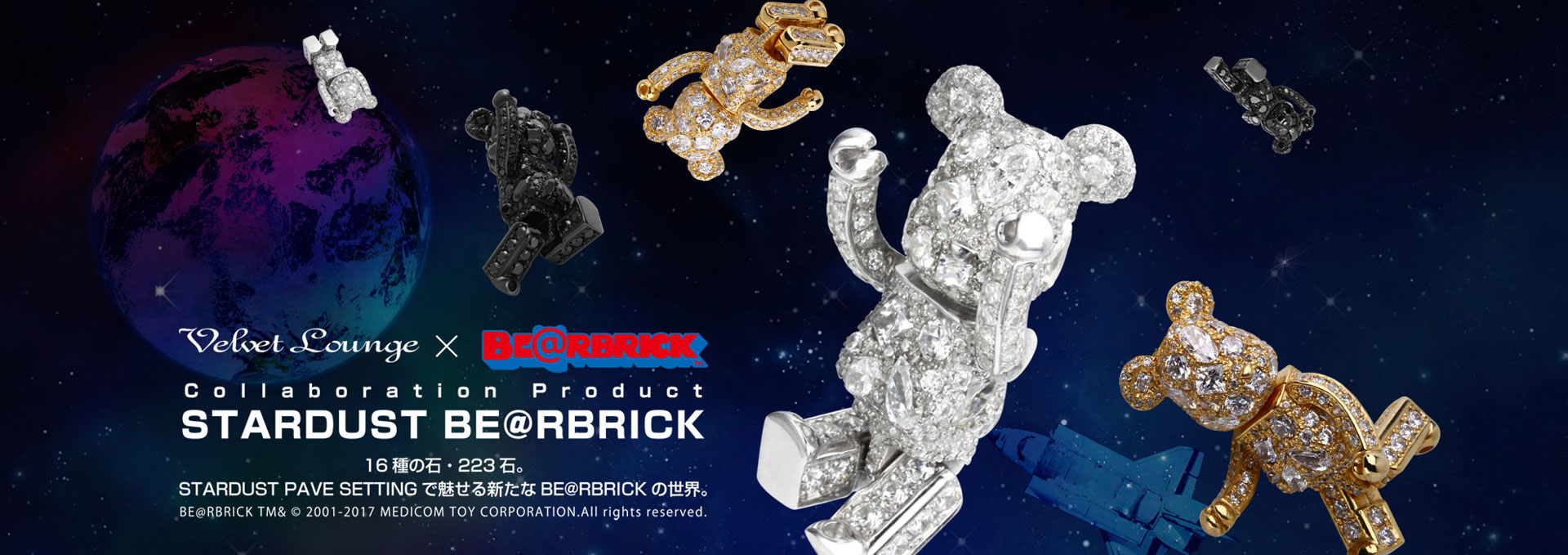猶如在夜空中閃爍的星辰,Velvet Loung以獨自研發出的"STARDUST鑲崁法",經專業的金工職人之手,把223顆大小形狀都不同CZ鑽石(鋯石)一個一個的鑲崁在高約5cm的小熊上。