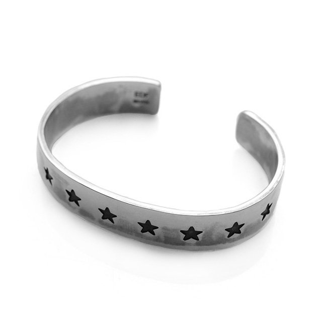 造型簡單俐落的寬版銀條上,刻有星星圖案的手環。