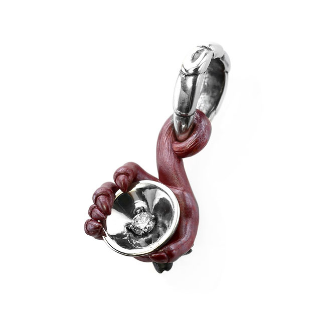 生肖墜飾採用「緋銅」材質呈現,仙猿手中握著的杯子中央閃耀著白色光芒的則是鑽石。