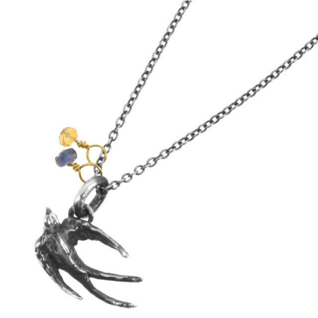 此款項鍊是「INDUSTRIAL JEWELRY FOR ROMANESQUE PEOPLE」系列作品,以展翅的燕子與寶石組合而成的純銀項鍊。