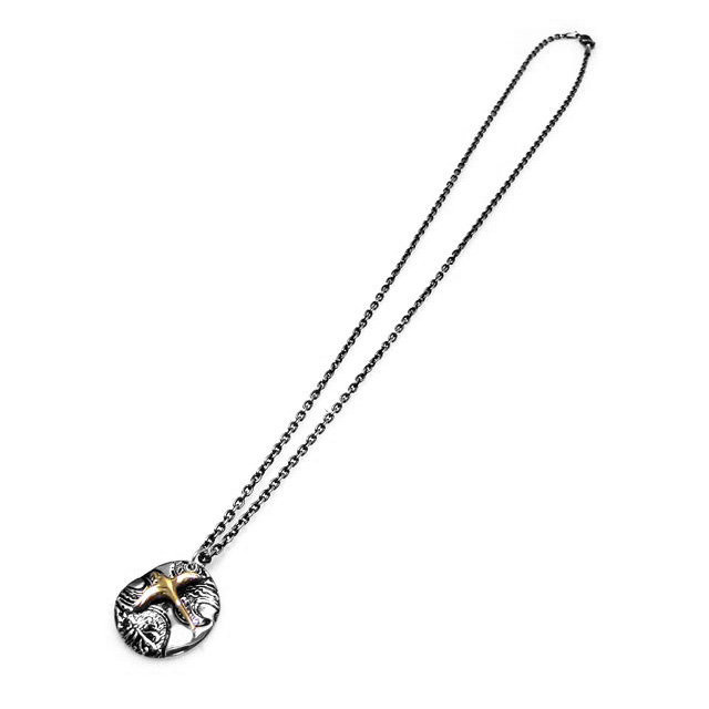 此款項鍊是「Drift in the Silk Road」系列作品。將回教寺院常使用的阿拉伯式圖騰的純銀圓盤為底,在上面加了一隻金色飛鳥。